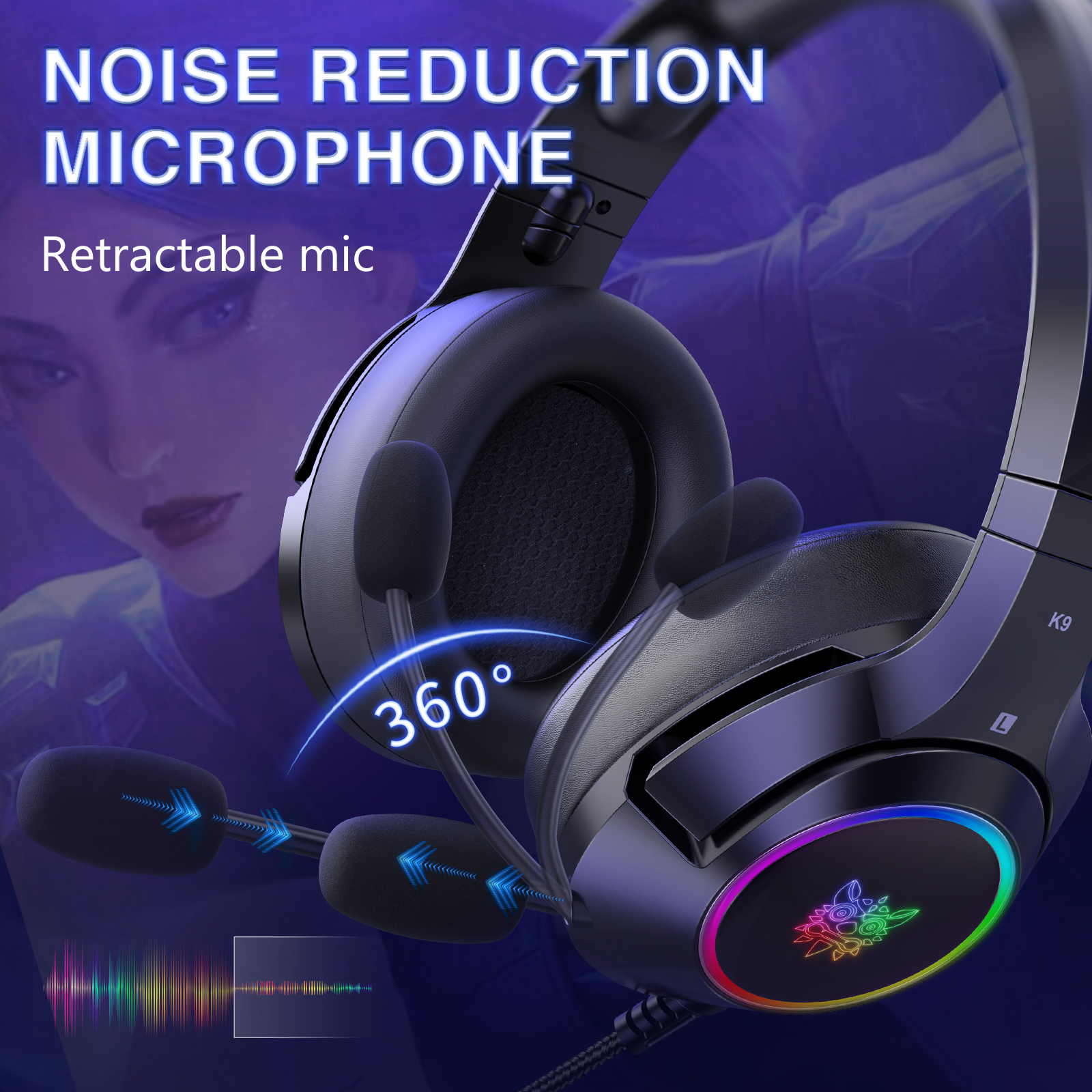 The Onikuma K9 RGB Wired Gaming Headset offers gamers a highly immersive experience with its powerful 50 mm drivers delivering clear, crisp sound and strong bass across the full 20 Hz to 20 kHz frequency range. The headset features an omnidirectional microphone with high sensitivity (-56 dB) and impedance (2.2 kΩ), ensuring clear voice transmission for gaming communication.